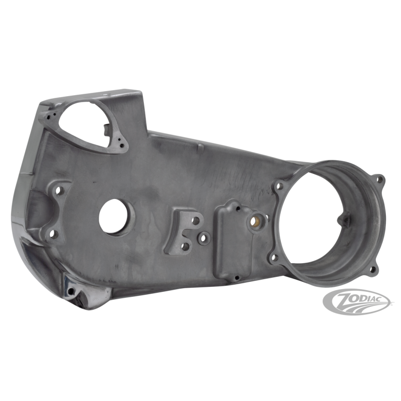 Ce carter primaire intérieur poli a le trou pour le levier de commande de changement de vitesse au milieu. Il a 9 trous pour le couvercle extérieur. Si votre couvercle n'a que 8 trous, le 9e n'est juste pas utilisé. Les renforts moulés rendent ce primaire intérieur très solide. A noter que le polissage n'est pas aux standards Zodiac et il est donc recommandé de le faire peindre ou thermolaquer.