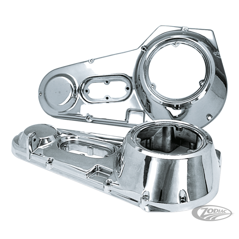 Couvercles primaires externes renforcés pour les Big Twin à 4 vitesses de 1970-1984 et les Softail à 5 vitesses jusqu'à 1988. Disponible pour les modèles FL et FX. Les deux modèles ont une jolie finition chromée. La seule différence entre les deux couvercles est que le FL comporte une patte pour le montage à l'avant du couvercle d'inspection. Le couvercle est prêt à installer sur tous les 8 trous primaires et il y a un bossage plat fourni pour un neuvième trou supplémentaire si vous le désirez. Le roulement à aiguilles pour l'arbre du démarreur doit être commandé séparément.