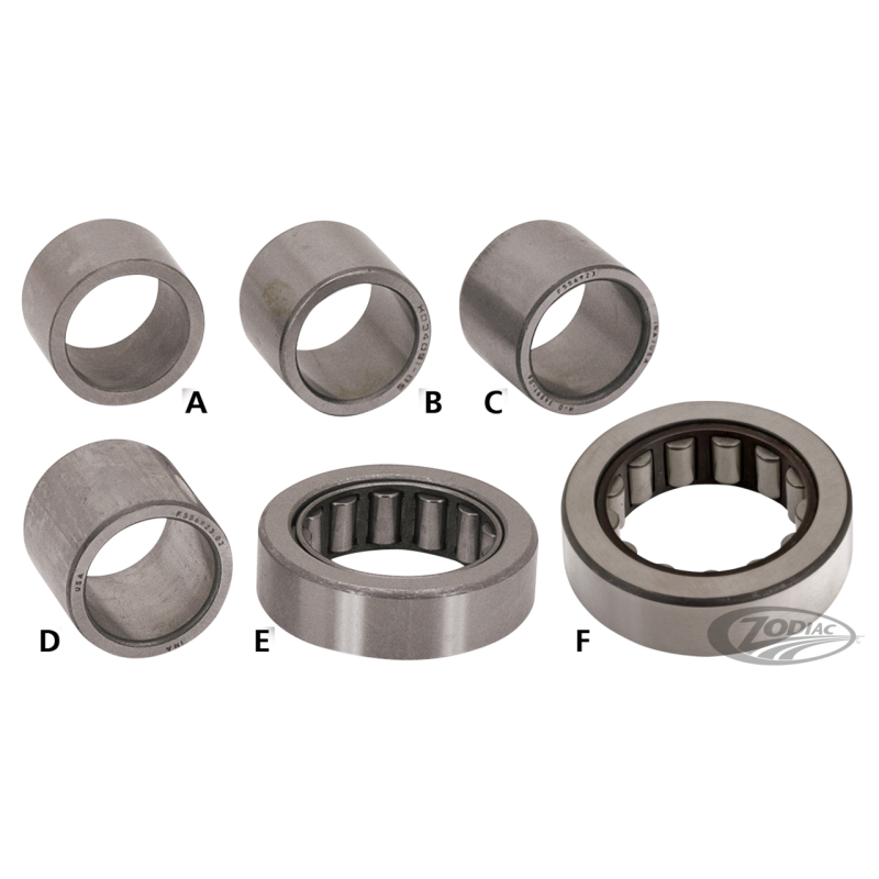 Roulement et portée d'arbre primaire de boite du carter primaire. Le roulement se monte sur tous les modèles avec roulement à rouleaux de 1984 au présent. La portée de roulement est disponible en taille standard (inch) pour les modèles de 1984 à début 1985 ainsi qu'en métrique pour les modèles de fin 1985-2006 ainsi que pour 2006 au présent Dyna boite 6 et 2007 au présent Softail et FLH. Roulements et portées sont vendus séparément.