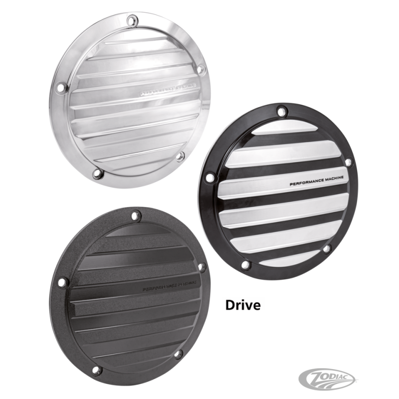 Trappes d'embrayage en aluminium usiné Performance Machine, elles sont disponibles en chromé, Contrast Cut noir avec des en aluminium usiné, Platinum Cut noir avec des coupes en aluminium poli ou noir bicolore Black Ops de PM qui va parfaitement avec la finition du moteur noir de chez Harley.