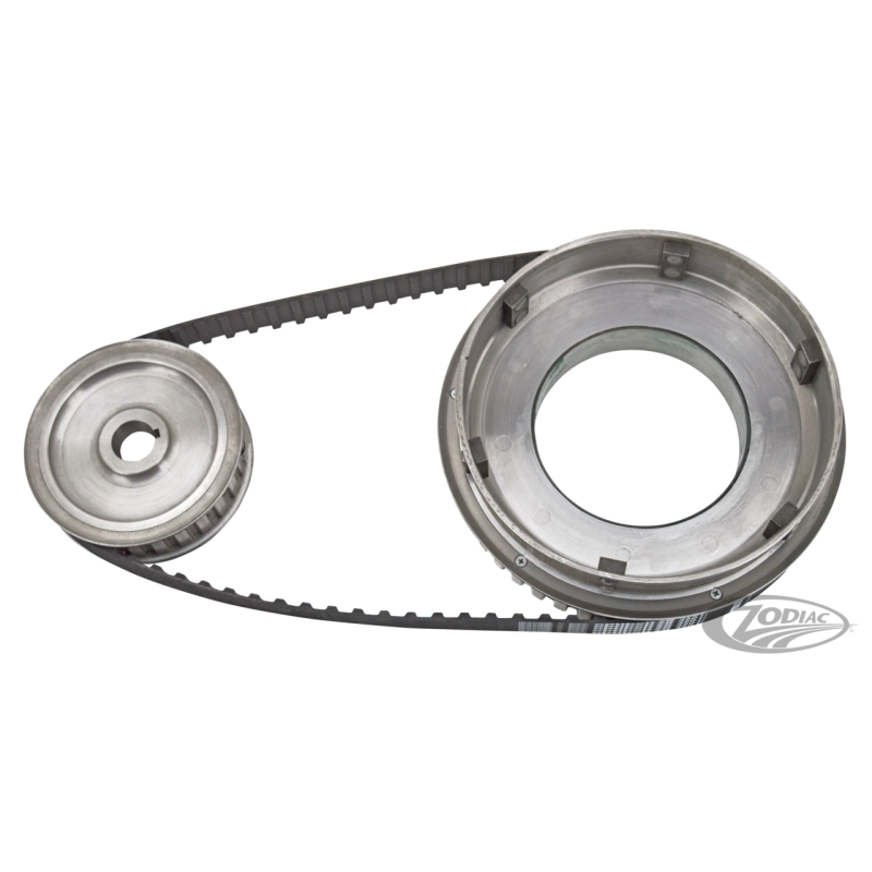 Ces kits d'entraînement par courroie vont dans le primaire d'origine de tous les 45CI Solo, Servicar et sidecar. Comprend poulies avant et arrière avec courroie assortie. Aide à garder votre moto propre. Nous vous recommandons fortement de ne pas installer ces kits d'entraînement par courroie en jonction avec notre kit roulement d'embrayage ZPN755841 Big Fix.