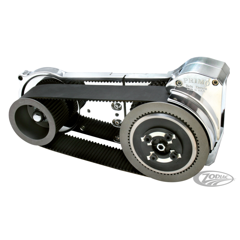 Ces kits courroie surclassent tous les autres en ce qui concerne le montage la finition la fiabilité et les performances. Ces kits Primo contiennent poulie avant, poulie arrière, courroie en 2" ou 3" et un ensemble complet Pro-Clutch à diaphragme. Les kits complets comprennent également une plaque moteur solide et le support de roulement avec roulement installé, pare-courroie et pour les modèles à démarreur électrique le logement et extension de démarreur et toute la visserie nécessaire au montage également comprise. L'Installation du kit ZPN720504 sur Shovelhead boite 4 nécessite l'achat séparé d'un démarreur de 1989 à 1993 ou 1994 à 2006. Pour les customs il existe des inserts de poulie et écrous déportés disponibles, ceux-ci sont répertoriés dans la liste des pièces optionnelles et de remplacement.