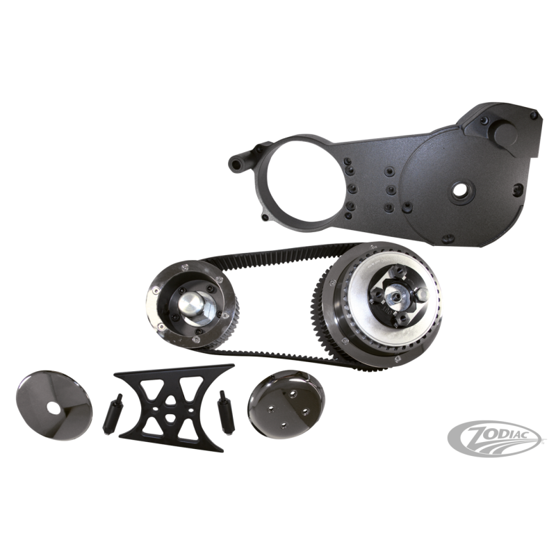 Ces kits courroie surclassent tous les autres en ce qui concerne le montage la finition la fiabilité et les performances. Ces kits Primo contiennent poulie avant, poulie arrière, courroie en 2" ou 3" et un ensemble complet Pro-Clutch à diaphragme. Les kits complets comprennent également une plaque moteur solide et le support de roulement avec roulement installé, pare-courroie et pour les modèles à démarreur électrique le logement et extension de démarreur et toute la visserie nécessaire au montage également comprise. L'Installation du kit ZPN720504 sur Shovelhead boite 4 nécessite l'achat séparé d'un démarreur de 1989 à 1993 ou 1994 à 2006. Pour les customs il existe des inserts de poulie et écrous déportés disponibles, ceux-ci sont répertoriés dans la liste des pièces optionnelles et de remplacement.
