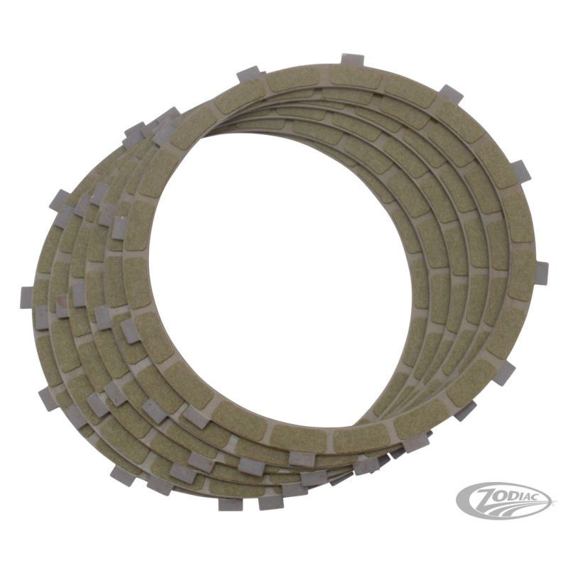 Pour Big Twin fin 1984-1989. Peut être utilisé avec des plaques d'entraînement en acier OEM ou de rechange., Le kit contient 6 disques garnis. Les disques sont plus larges et donnent 25% de surface de friction en plus (OEM 37930-84)