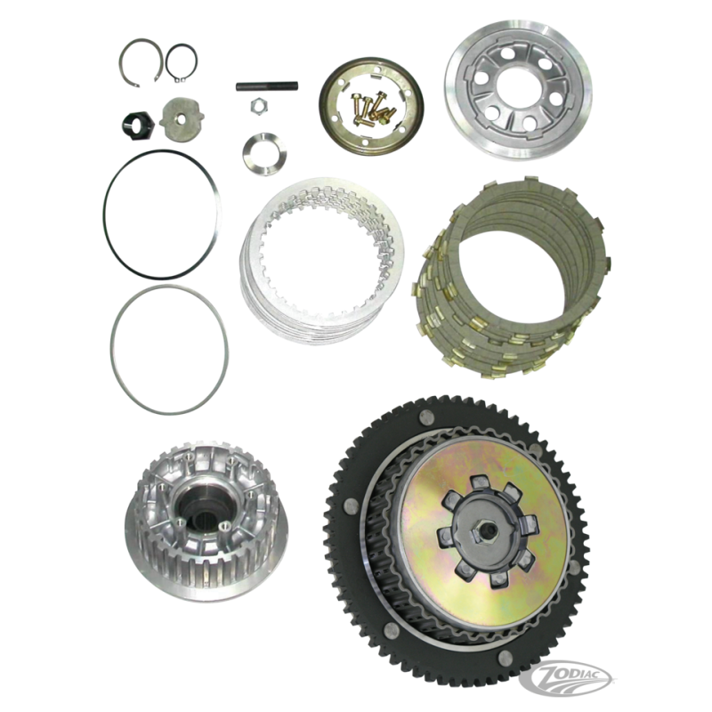 Ces embrayages complets hautes performances sont prêts à installer et ont des disques garnis Kevlar tout en étant à un tarifs très compétitif. Toutes les pièces existent séprément et elles sont toutes complètement interchangeables avec de l'origine. Les pièces de remplacement sont listées ailleurs dans ce chapitre. Ces embrayages complets hautes performances comprennent la cloche d'embrayage avec sa couronne de démarreur installée, les roulements et circlips, la noix d'embrayage, les disques garnis Kevlar, les disques lisse, disque de plateau de pression, diaphragme et butée réglable.