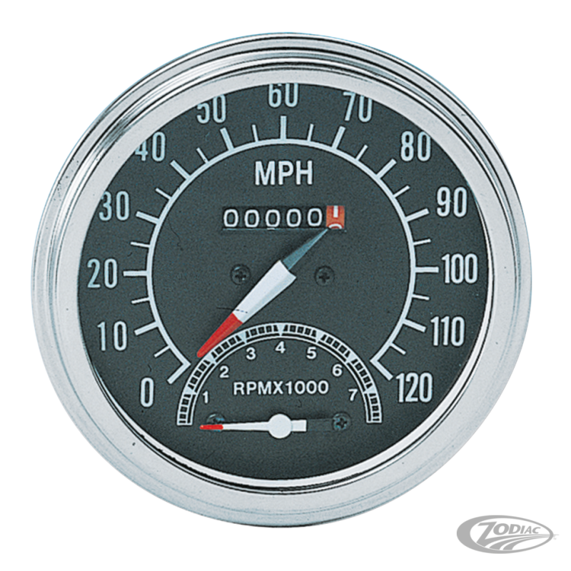 Nouvelle combinaison améliorée de compteur de vitesse et tachymètre pour tous les grands tableaux de bord des Fat Bob de 1947 jusqu'au présent. Le compteur de vitesse est combiné avec un tachymètre électronique de 6000 r/m qui suit avec précision la vitesse du moteur. Le compteur d'un rapport de 2:1 fonctionne avec les modèles FL, FX et FXWG depuis 1968. Celui d'un rapport de 1:1 s'utilise sur les modèles de 1947-1967 à compteur guidé par la transmission. Nous vous recommandons d'utiliser l'un de nos câbles (ZPN114152, 114246) lorsque vous les installez avec des unités à traction avant. A votre choix de présentation en M/H ou en K/H.