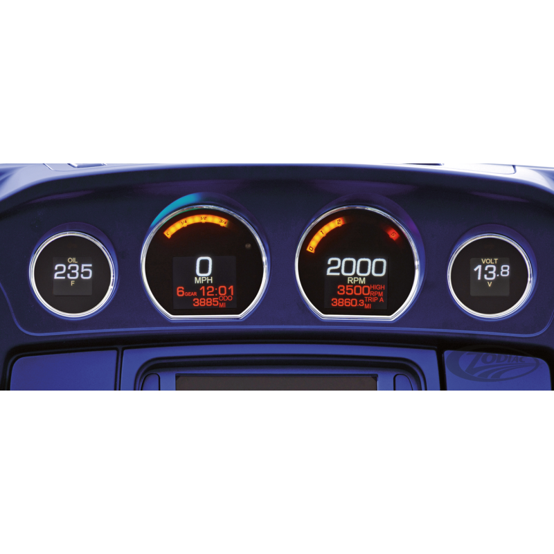 Système d'instrumentation à montage direct pour 1996 aux présent FLTR Road Glide, FLHTCU Ultra Classic, CVO Touring et Tri-Glide équipés d'un carénage. Disponibles avec cerclages noirs ou chromés pour les modèles 1996-2003 et 2004-2013. Les modèles ultérieurs réutilisent les cerclages d'origine. Caractéristiques suivantes: •31 couleurs d'éclairage différentes •12 thèmes prédéfinis •De nombreux affichages d'informations personnalisables •Affichage qui s’assombrit automatiquement pour la conduite de nuit ou à fort contraste en plein soleil •Vitesse jusqu’à 250MPH ou 400KM/H •Compte-tours avec un barre graphique autour •Jauge de température d'huile (avec émetteur inclus) • Voltmètre en décimales •Le niveau de carburant se situe autour du sommet du compteur •Indicateur de position du rapport •Horloge •Compteur kilométrique avec compteurs journaliers A&B • Option de distance de révision (compte à rebours réglable par l'utilisateur) •Surveillance de la pression des pneus sur les modèles équipés en usine •Indicateurs standard comprenant: clignotant, plein phare, cruise control, immobilisateur de sécurité, avertissement ABS, feux de recul et feux de position pour les modèles Tri-Glide •Calculateur de performances comprenant: minuterie 0-60MPH, temps de 1/4 mile rappel vitesse/tour/min Tous les instruments de la série MLX sont paramétrables par une application mobile sur des appareils iOS et Android.