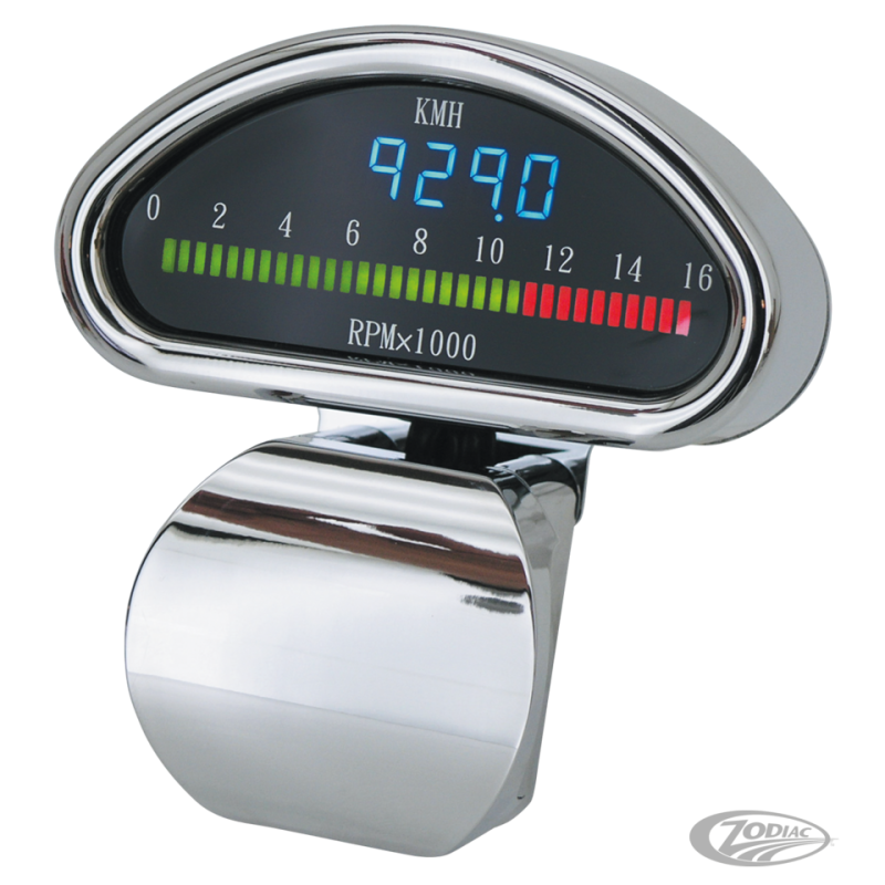 Pour les constructeurs de custom qui en veulent plus que la moyenne, Pro-Max a conçu et développé ce système unique et très complet de compteur et comptetour. Cet instrument digital comporte un compte-tour intégré qui affiche le régime avec des barres, un compteur digital, totalisateur partiel mais aussi des voyants pour les plein phares, point mort, pression d'huile et clignotants. Fonctionne avec les boites équippées de capteur de vitesse électronique comme sur les modèles de 1994 à 2003. Sinon il existe aussi un générateur d'impulsions qui se monte sur l'entrainement de compteur mécanique de roue avant. Le pro-max comprend un programme pour l'ajuster à votre boite et rapport final. Tout ceci dans un joli carter usiné en aluminium et chromé, il mesure 4 11/32" (110mm) de long, 2 7/32" (57mm) de haut et 1 1/64" (38mm). Les supports de guidon sont disponibles en diamètre de 1" (25.4mm), 1 1/4" (31.75mm) et 1 1/2" (38.1mm) en version lisse ou 3 rainures, ils doivent être commandés séparément. Ne convient pas pour les modèles plus récents avec le système CAN-Bus (HD-Link).