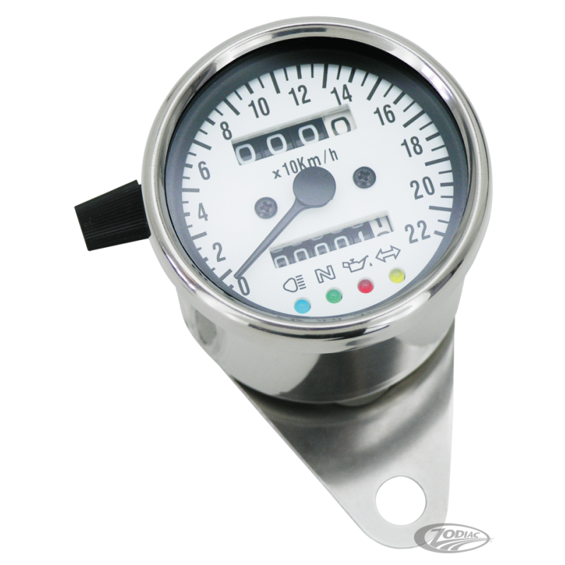 Ces compteurs de 60mm de diamètre peuvent être utilisés sur les modèles avec un entraînement de câble de roue ratio 2:1 comme sur les 1947 à 1967 FL, 1981 à 1984 FX et FXR et 1954 à 1994 Sportster. Ils ont une face blanche, boîtier et cerclage en acier inoxydable et vitesse en MPH ou KMH, compteur kilométrique, compteur journalier et voyants de contrôle pour Phare, point mort, pression d'huile, et clignotants. Ils sont pré-câblés et complets avec une fixation guidon pour une utilisation sur guidon de 5/8" à 1 1/4".