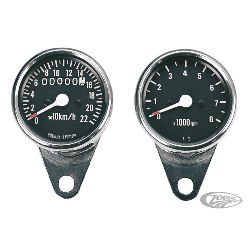 Compteurs et comte-tours à câble en 60mm de diamètre 2:1, pour FL 1947-1967 & 1981-1984, FX 1973-1986, FXR 1982-1994 et Sportster 1954-1995 avec entrainement sur la roue avant, En Km/h