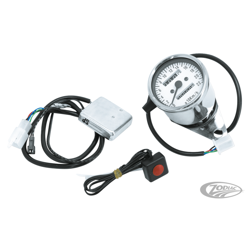 Une simple pression sur un bouton vous permet de changer la couleur de la face de ces mini compteurs. Vous pouvez passer de rouge à l'orange, bleu, vert, jaune, blanc ou violet au choix. Ces compteurs il ne font que 2 3/8" (61mm) de diamètre, 2 3/4" de long (70mm) et le cerclage en haut fait 2 5/8" (67mm). Le carter est en inox poli. Livré pré-câblé pour une installation facile. Existent en ratios 1:1 et 2:1 en MPH ou KM/H.