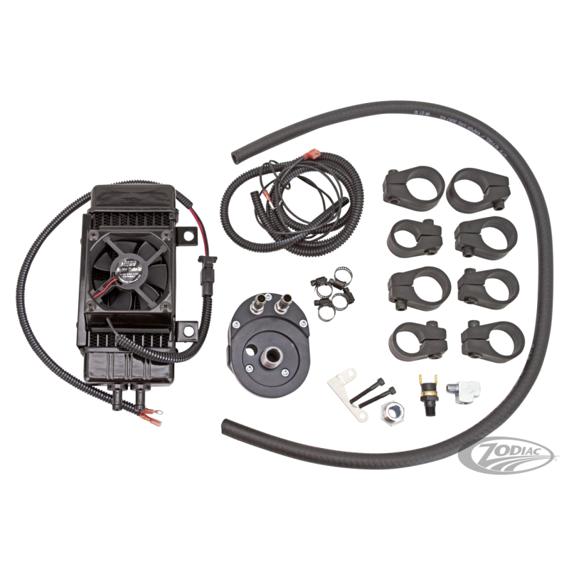 Une performance extrême dans un boîtier compact, le radiateur vertical Jagg assisté par ventilateur est conçu pour fonctionner aussi bien à de faibles vitesses et en stop-and-go dans les bouchons que sur la route ouverte. La haute performance des deux passages et des 10 lignes vont sur toutes les motos avec tubes de châssis verticaux. Spécialement conçu pour dépasser les exigences de refroidissement des V-Twin modernes. Embouts lisses et une finition noir brillante. Ce radiateur va bien avec le cadre et le matériel pour un aspect propre et simplifié. Les pattes de montage sont sur le tube descendant gauche bien espacées du châssis pour permettre au flux d'air de passer à la fois sur le radiateur et les cylindres du moteur. Le radiateur est monté sur le châssis en utilisant des supports Uralite uniques, hautement durables qui ont un effet d'absorption des vibrations. La conception 10 tube, deux passes offre considérablement plus de surface de refroidissement que son plus proche concurrent. Tubes spéciaux en ligne ajouter à l'efficacité avec une perte de pression d'huile ou restriction minimale. La construction est en aluminium époxy noirt. Le Jagg WeatherTek est un ventilateur étanche à la poussière et à l'eau exclusif dans le monde entier, il se met automatiquement en route à environ 100°C (210°F) et tire un 75cfm dans le radiateur. Adaptateur de filtre à huile uniques décalé, thermostatique Jagg inclus qui fournit un point d'accès facile à l'approvisionnement en huile pour l'installation du refroidisseur d'huile. L'adaptateur sandwich est usiné à partir de deux pièces en aluminium usiné puis anodisé dur pour une finition noire satinée. L'adaptateur s'installe entre le filtre à huile et le carter et est conçu avec la même technologie Hyper flux que tous les composants Jagg pour assurer d'excellentes performances ainsi que de grandes caractéristiques d'écoulement. Le radiateur d'huile Jagg avec ventilateur est fourni avec tout le matériel et des instructions d'installation faciles à suivre détaillées nécessaires.