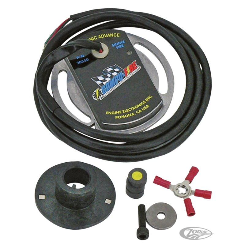Cet allumage au top est conçu pour la plupart des moteurs et ce sont les plus simples à utiliser du marché. Ce kit allumage tient entièrement dans votre carter, aucun boîtier externe n'est requis. Peut être utilisé en Dual et Single Fire. L'allumage comprend 8 courbes d'avance sélectionables, témoin de calage d'allumage statique avec LED, limiteur de régime et diagnostic de VOES. Il fonctionne également avec un Voltage faible selon un mode spécial au démarrage pour faciliter celui-ci. Cet allumage est est sélectionnable single fire ou dual fire et est pour bobine entre 2.5 et 3 Ohms. Les VOES est réglable. Utilisez l'adaptateur ZPN238038 en mode single fire pour utiliser le compte tours d'origine ou aftermarket. Existe en version pour moteur stock ou moyennement modifié ainsi qu'en une version pour moteur haute compression. Cett version haute compression n'est pas recommandée pour démarrage au kick. Ces alluamges Compufire vont sur les 1970-1999 Big Twin (sauf Twin Cam) et 1971-2003 Sportster.