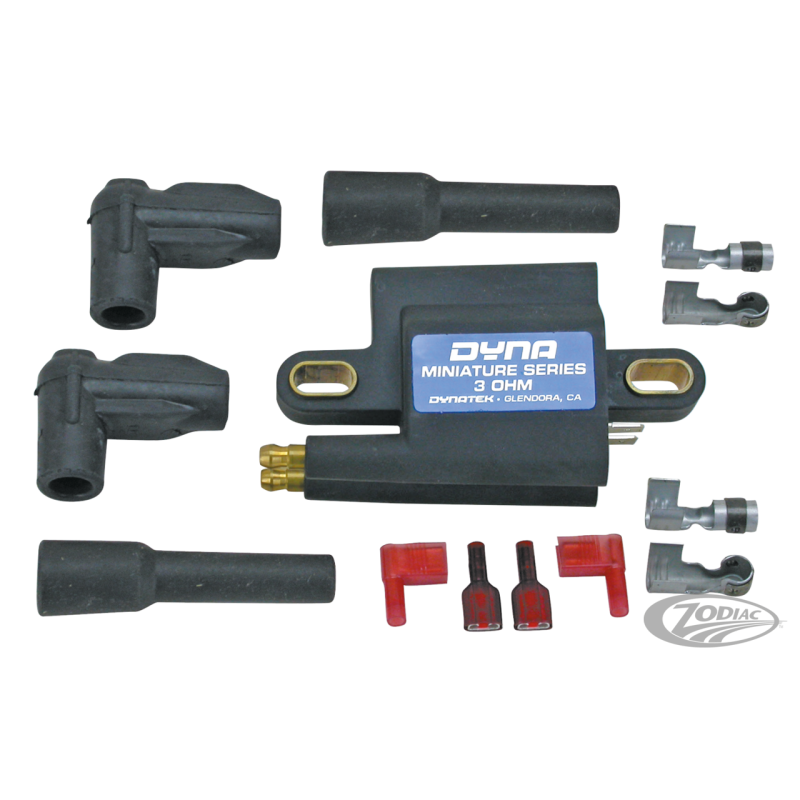 En tant que leader du marché Dynatek se devait de faciliter le vie des customiseurs. Les dernière technologies avec noyau magnétique permettent de délivrer une haute puissance avec la taille la plus petite possible. Parfait pour tout custom bike ou les bobines ont besoin d'être cachées. Elles ne mesurent que 10.6 cm x 5.8 cm x 4 cm. Bobines Dyna miniatures pour allumages série Dyna 2000 et 3000, allumage d'origine et tous les autres allumages after-market qui nécessitent la même impédence. Ces bobines Miniatures ont une tension de sortie de 35.000 Volts et une énergie de 50 mj à l'étincelle.