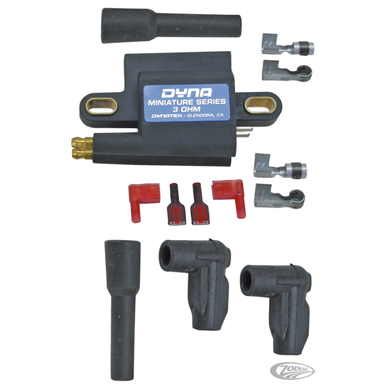 En tant que leader du marché Dynatek se devait de faciliter le vie des customiseurs. Les dernière technologies avec noyau magnétique permettent de délivrer une haute puissance avec la taille la plus petite possible. Parfait pour tout custom bike ou les bobines ont besoin d'être cachées. Elles ne mesurent que 10.6 cm x 5.8 cm x 4 cm. Bobines Dyna miniatures pour allumages série Dyna 2000 et 3000, allumage d'origine et tous les autres allumages after-market qui nécessitent la même impédence. Ces bobines Miniatures ont une tension de sortie de 35.000 Volts et une énergie de 50 mj à l'étincelle.