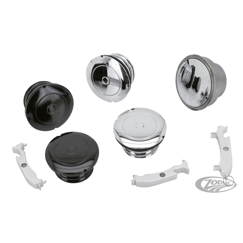 Bouchons chromes ou anodizes noir qui peuvent être utilisés en remplacement des modèles de 1982-2017 avec bouchons à vis. Les bouchons ventilé et non-ventilé sont vendus par jeu et aussi séparément. Pour les customiseurs nous proposons une version à souder qui est livrée complète avec sa goulotte. Pour remplir le réservoir vous devez ouvrir le bouchon avec l'outil spécial fourni dans le kit. Nous avons même offert à cet outil usiné une fonction qui lui permet aussi d'ouvrir les bouteilles de bierre!