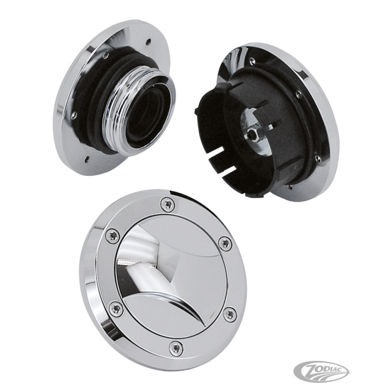 Ces bouchons d'essence affleurants ont ce look très recherché des trappes d'essence avaiation. Ils vont sur tous les modèles 1982-2017 et ont une finition chromée parfaite. Facile à installer, il faut juste visser l'anneau directement dans votre réservoir. Les têtes Allen sont réelles mais ne fixent pas anneau. Les bouchons ont un mécanisme de cliquet pour éviter que vous serriez trop et ne puissiez les ouvrir de nouveau. Commandez une version ventilée pour les réservoirs avec un bouchon et un de chaque pour les réservoirs à deux bouchons. Il existe un bouchon factice pour remplacer la jauge de carburant comme monté sur beaucoup de modèles sur le réservoir à essence gauche qui est aussi disponible.