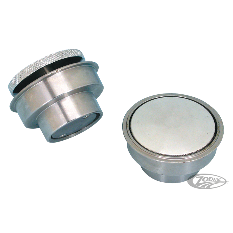 Ces bouchons "Pop-Up" donneront à votre réservoir un look lisse et custom comme vous pouvez le trouver chez les bons faiseurs de customs. Ils sont très faciles à ouvrir, appuyez dessus en tournant et le bouchon sort, il nous vous reste plus qu'à le dévisser. Peu importe si vous avez un réservoir en alu ou en acier car Zodiac propose cetarticle avec au choix une goulotte en acier ou en alu. Ces bouchons sont ventilés et sont disponibles en aluminium chromé de haute qualité ou prêts à peindre en aluminium. La goulotte a un diamètre extérieur de 2 5/16" (59mm), les bouchons font 55mm de diamètre.