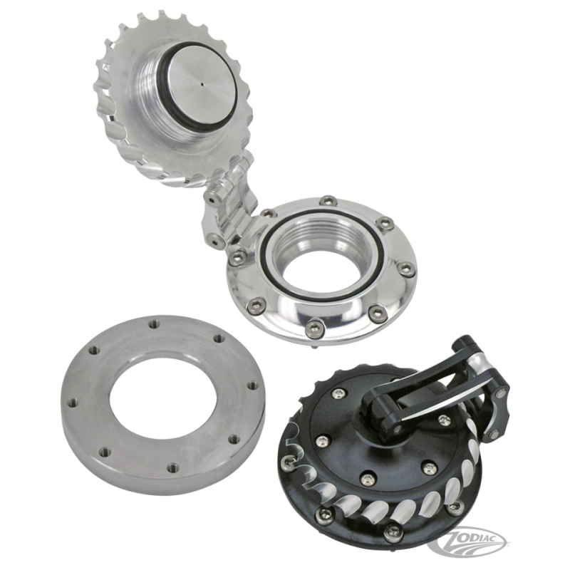 Bouchons de réservoir Neo-Fusion Ken's Factory usinés en aluminium par Ken's Factory et disponibles en poli ou noir anodisé avec des coupes claires. Ces bouchons de 2 3/4" (70mm) de diamètre ont un astucieux système d'ouverture et de fermeture et sont livrés complets avec visserie inox pour les fixer aux inserts qui sont vendus séparément qui sont en acier ou en aluminium.