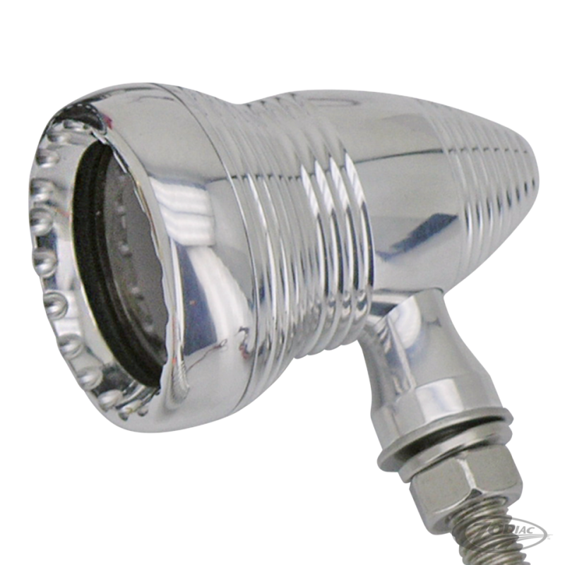Clignotants Ken's Factory avec un vrai style custom. Fabriqué au Japon Ken's factory en aluminium massif avec une finition polie ou noir anodisé et comprennent 10 LEDs brillantes. Ils font 1 3/4" (4.5 cm) de diamètre extérieur, 2 3/8" (6 cm) de long et sont vendus pièce.
