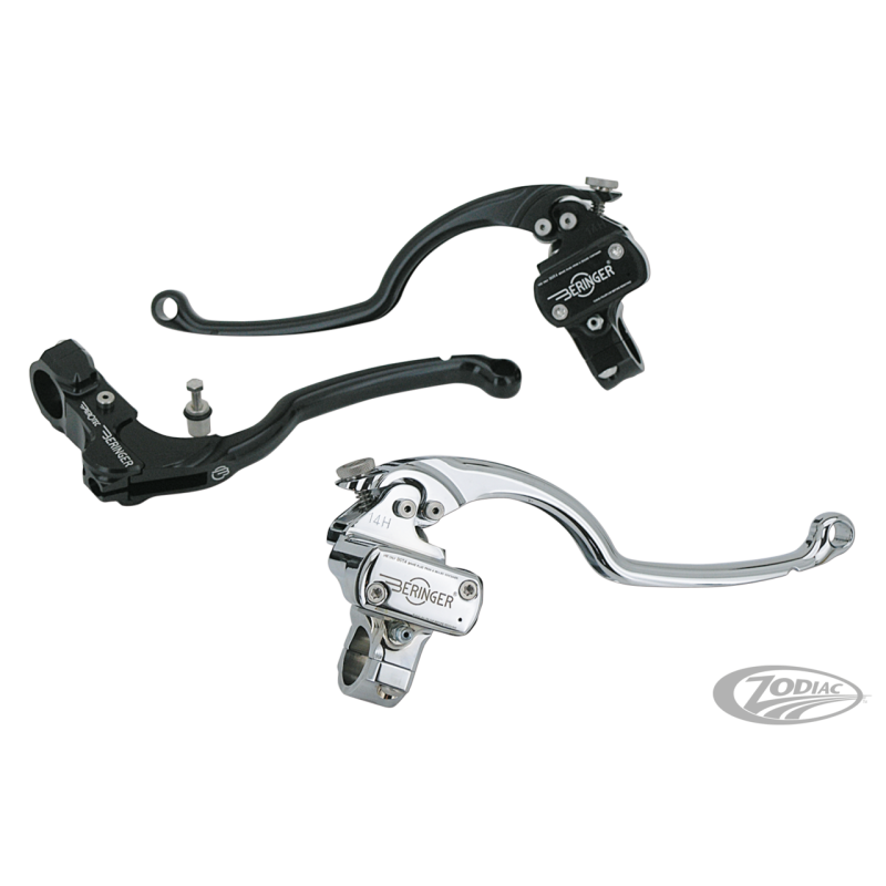 Les maitre cylindre de frein et d'embrayage Beringer sont une véritable pièce de développement high-tech avec leur système hydraulique radial et leur levier placé sur trois roulements à billes pour réduire les frictions. Cette combinaison procure le maximum de force de freinage et d'embrayage avec le minimum d'effort au levier. Le diamètre du piston est optimisé pour être utilisé avec n'importe quel étrier 4 ou 6 pistons Beringer avec un ou deux étriers. Le maitre cylindre de frein et son levier d'embrayage pour câble assorti sont disponibles en finitions polie, noire, ou chromé. Il existe un contacteur électrique qui va dans chacun des maitre-cylindre qui est disponible séparément.