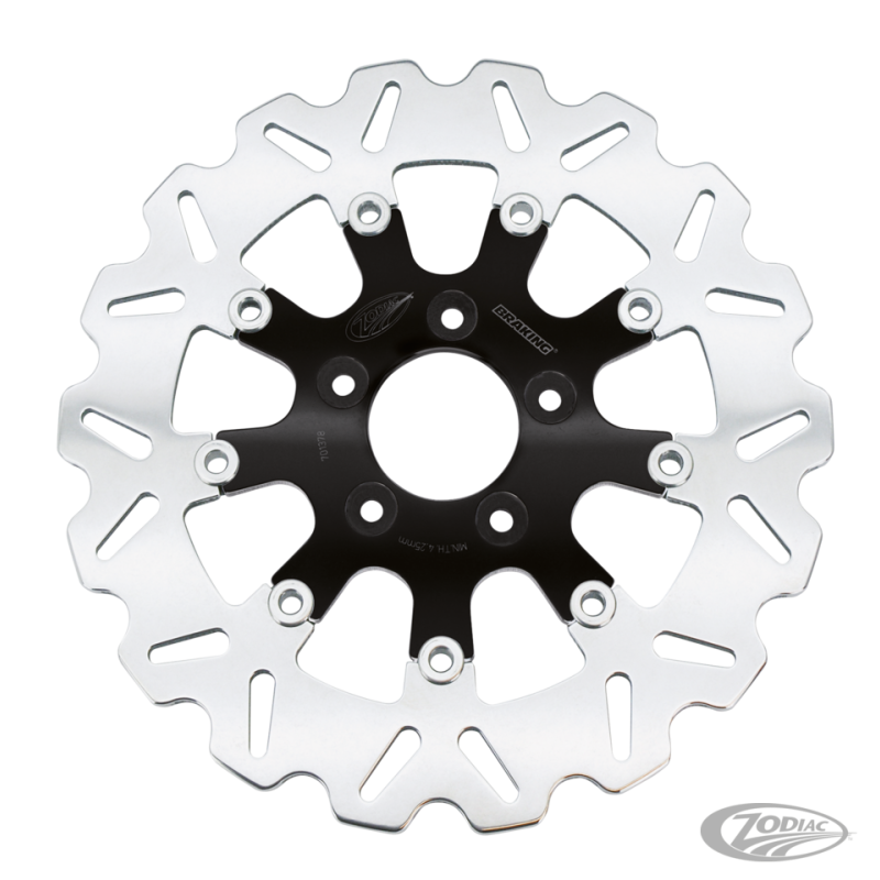 Pour l'avant de tout modèle avec simple ou double disque de 2000 à 2013 Sportster, 2000 à 2007 Touring, 2000 à 2005 Dyna et 2000 à 2014 Softail. Le disque fait 11 1/2" en extérieur (292mm) et 2.22" (56.4mm) en intérieur avec trous de 5/16" fraisés., Disque flottant avec centre noir
