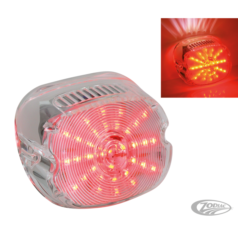 Ces feux style custom ont un profil bas qui est 33% inférieur à celui d'origine. Ils utilisent des LEDs brillantes pour les focntions de feu, de stop et d'éclairage de plaque. Ces feux son très faciles à installer car ils remplacent directement ceux d'origine sur la plupart des modèles de 1999 au présent sauf sur les FXSTD "Deuce" et V-Rod. Disponibles avec lentille claire, rouge ou fumée et ils sont tous homologués CEE.