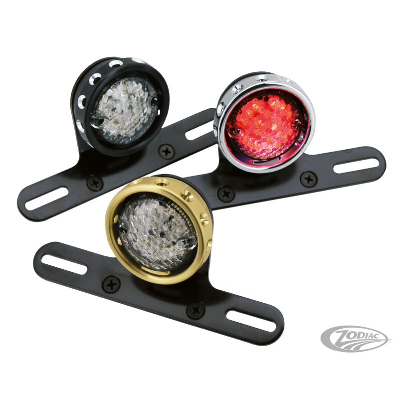 Ces feux arrière classiques sont homologués CEE et sont équippés de LEDs brillantes pour le feu arrière, le feu stop et l'éclairage de plaque, ils sont intégrés dans un boitier usiné aluminium de 2 3/4" diamètre. Les boîtiers ont des ouvertures rondes ou en fentes sur le côté. Quand la lumière des feux arrière ou frein s'allume, la lumière est également visible à travers ces ouvertures. Ces feux sont pré-câblés et disposent d'un support de plaque en acier. Disponible en noir avec des coupes alu, tout chromé ou tout or.