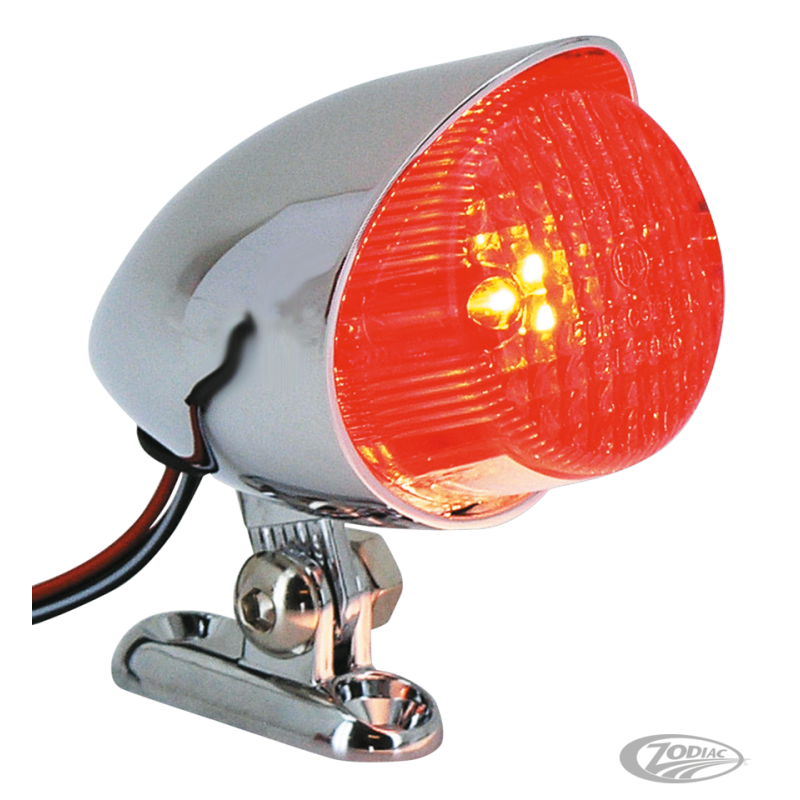 Ce feu arrière chromé Hi-Glide streamliner bullet mesure 3 1/2" (9 cm) de long et 2 1/4" (6 cm) de diameètre. La hauteur totale est de 3" (7.5 cm), y compris le support de montage à deux trous. Homologué CEE et comporte l'illumination de la plaque d'immatriculation. Il est livré pré-câblé pour le feu et le feu stop.
