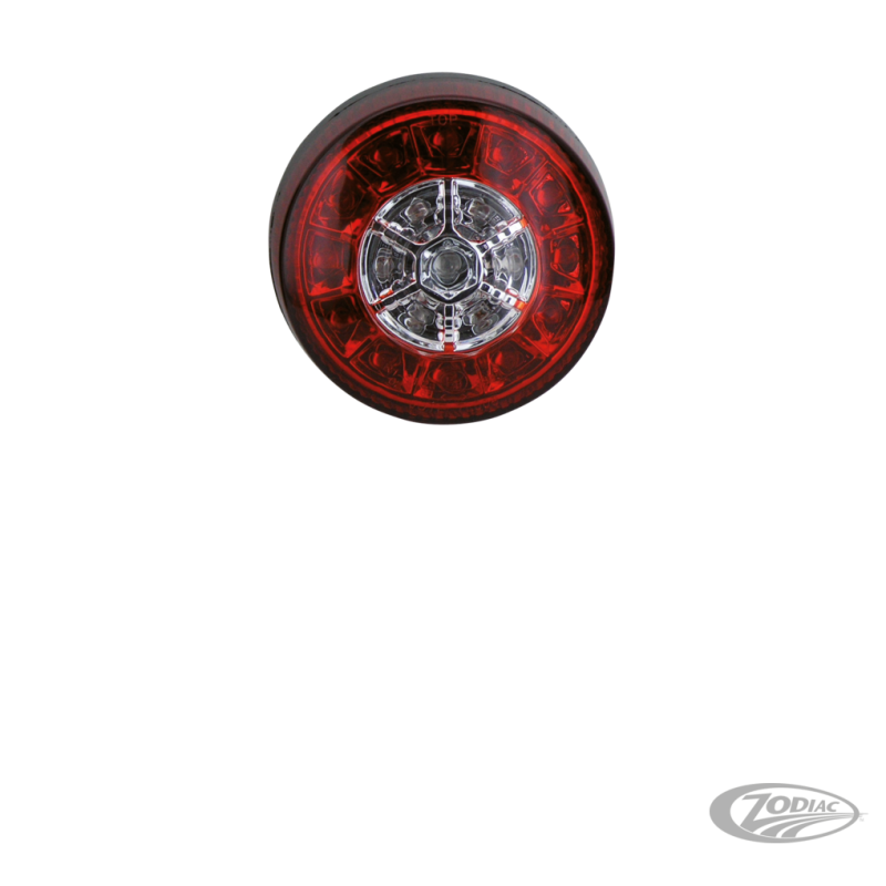 Ce feu arrière roulette a 12 LED pour les fonctions de freinage et de feux arrière-ainsi que 6 LED oranges qui peuvent être utilisées comme clignotant gauche ou droit. Lorsque vous voulez utiliser cette fonction vous devrez donc installer deux feux roulette par exemple sur des sacoches rigides ou tout autres projet custom. Ils font 3 3/16 " (8 cm) de diamètre et 1 3/8" (3,5 cm) de haut ils ont deux tiges filetées M6 distantes de 4,3 cm pour le montage et sont livrés pré-câblés. Ne possède d'éclairage de plaque. Le feu arrière de roulette est vendu pièce.