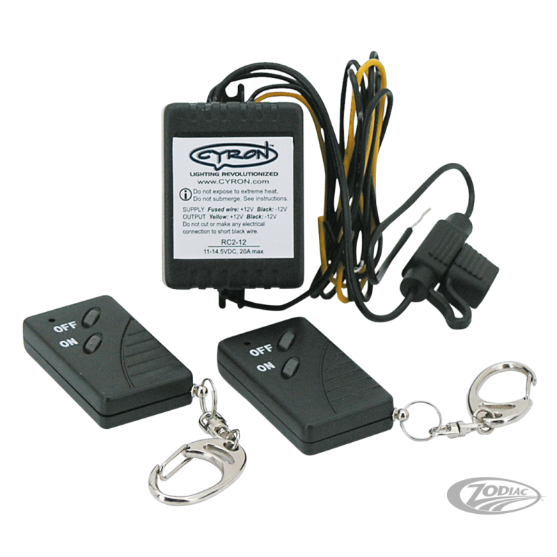 Cette télécommande est le même que celle qui est comprise dans les kits Cyron Gold et Platinum. Elle vous permet d'allumer et d'éteindre votre installation de LEDs sur une distance jusqu'à 30 mètres! Ce sera la touche finale qui rendra votre installation LED 100% complète. La télécommande remplacera l'interrupteur on-off ce qui rendra le système totalement invisible et intouchable. Le relais supporte 3 Ampères. L'utilisation n'est pas limitée à la moto. La RC1-12 peut être utilisée pouyr n'importe quel accessoire On/Off en 12VDC!