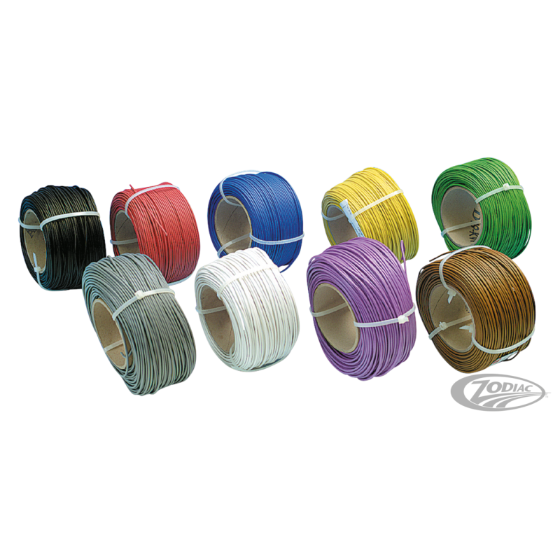 En avez-vous assez d'utiliser du câblage électrique "trop épais ou de mauvaise couleur" lorsque vous faites un faisceau de câblage Custom ou pour allonger/réparer le harnais de câblage actuel? Zodiac offre une grande variété de fil électrique de haute qualité avec un noyau de cuivre de 100% de 0.75mm spécialement pour utilisation sur moto.