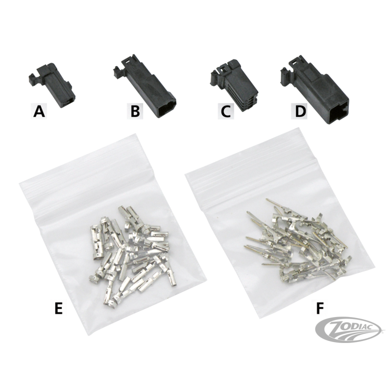 Connecteurs de la série AMP 040 Mini Multilock qui se trouvent sur tous les FLH et FLT Touring 2001 au présent et sont également utilisés sur les poignées chauffantes. Terminaux vendus paq. 25.