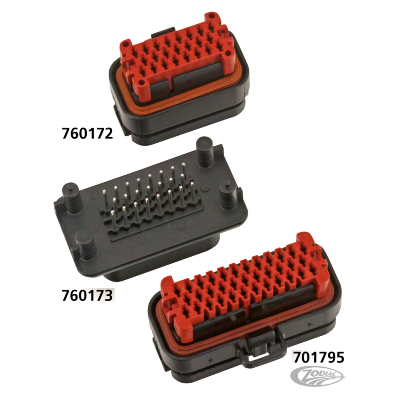 Ce connecteur 23-positions se trouve sur la plupart des Tourign standard et en 35 positions sur les 2006-2013 Ultra classiques et les modèles Touring et qui sont équipés avec l'accessoire Radio Harman Kardon-OEM et est pour l'ensemble de haut-parleur arrière et interface CB. Les broches pour aller dans les réceptacles femelles requis sont ZPN760172 et 701795 et vendus par 50.