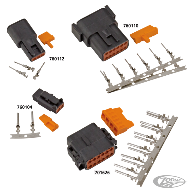 Les mini-connecteurs Deutsch se retrouvent sur de nombreux Harley-Davidson 1998 au présent. Faciliter la vie nous fournissons ces ensembles complets avec une prise mâle ou femelle avec des cosses et des cales, quand les pièces d'origine sont livrées au détail.