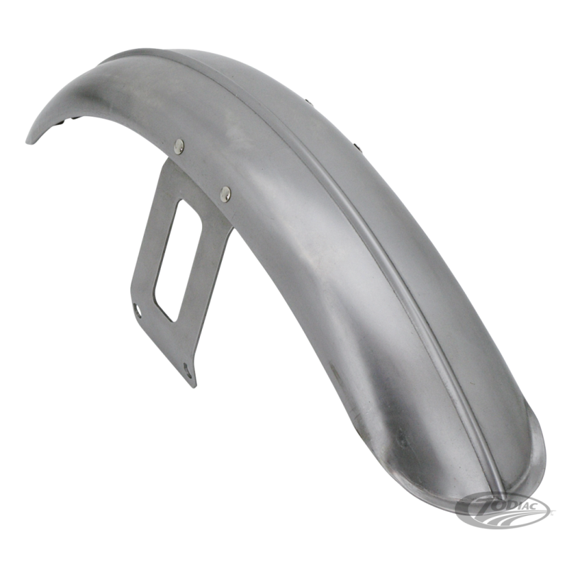Ce garde-boue avant mustang en acier a un design qui est inspiré par les voitures américaines et motos Vintage. Il a une nervure classique d'avant en arrière. Livré avec ou sans le support de fixation pour aller sur les fourches Wide Glide ou Narrow Glide et roues de 18 ", 19" ou 21" roues. Si vous pliez les fixations du modèle narrow glide vous pouvez également le monter sur une fourche mid-glide. Assortis aux réservoirs de même style qui se trouvent au chapitre 20.