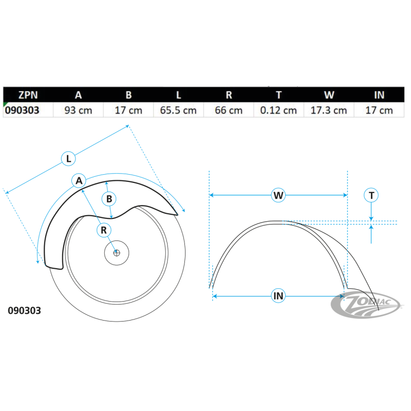 • A=93 cm, B=17 cm, IN=17 cm, L=65.5 cm, R=66 cm, T=1.2mm, W=17.3 cm