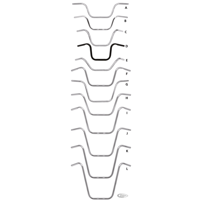 Le guidon Ape Hanger n'a jamais été absent. Ils sont fabriqués à partir de tubes de gros calibre, des coudes cintrés avec précision et ont un triple chromage ou noir époxy. Les empreintes permettent une installation facile de 1982 pour présent des commandes style Harley-Davidson. Le moletage donnent aux potences plus d'adhérence, la distance de centre à centre est indiquée en "G", alors vérifiez si cela correspond à votre application. Ces guidons ne conviennent pas pour les tirages électriques.