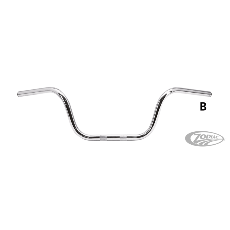 Le guidon Ape Hanger n'a jamais été absent. Ils sont fabriqués à partir de tubes de gros calibre, des coudes cintrés avec précision et ont un triple chromage ou noir époxy. Les empreintes permettent une installation facile de 1982 pour présent des commandes style Harley-Davidson. Le moletage donnent aux potences plus d'adhérence, la distance de centre à centre est indiquée en "G", alors vérifiez si cela correspond à votre application. Ces guidons ne conviennent pas pour les tirages électriques.