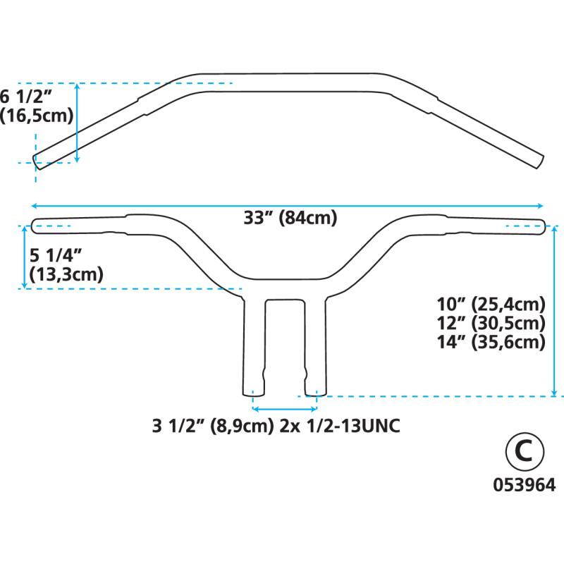 Ces guidons ont un diamètre de 32mm (1 1/4") et une extrémité de 25,4mm (1") pour accepter les commandes d'origine. Ils des empreintes et aussi pré-percées pour accepter le câblage interne. Pour boulons UNC de 1/2"-13 comme ZPN 233383 et Harley avec un entraxe de 3 1/2" (89mm). Boulons non inclus. Les guidons prêts à prendre Throttle-by-Wire sont indiqués avec TBW. Note: à utiliser avec les embrayages commandés par câble. Le guidon doit être modifié pour accepter la commande d'embrayage hydraulique.