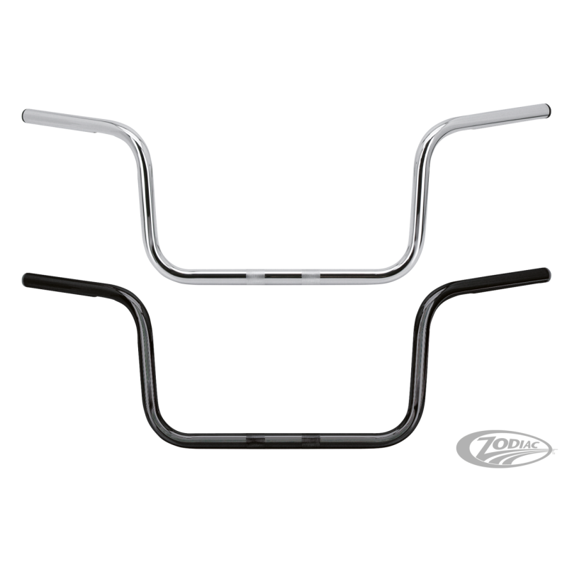 Ces guidons sont environ 1 1/2" (4 cm) plus haut et 2" (5 cm) plus loin du pilote que les guidons stock disponibles sur les Electra Glide. Se montent aussi sur presque n'importe quel autre modèle de Harley. Les quidons sont percés et emboutis pour le câblage interne. Disponible en chromé et noir. Haut totale 9 3/4" (25 cm), largeur 34" (86 cm), largeur centre 17" (43 cm) et retour 5" (13 cm).