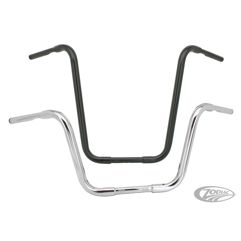 Les guidons ApeHanger ont toutjours été dans le coup. Les Ape de Zodiac sont fabriqués à partir de tubes épais de 1 1/4". Tous les guidons ont des coudes à mandrin, votre garantie pour un look symétrique parfait et un diamètre constant. Ces guidons élégants ultimes disposent ont leurs extrémités réduites se monter avec les commandes, poignées et risers d'origine ou aftermaket. Il est fortement recommandé de monter ces guidons avec des pontets de risers en une seule pièce. Ne conviennent pas aux tirages électriques.