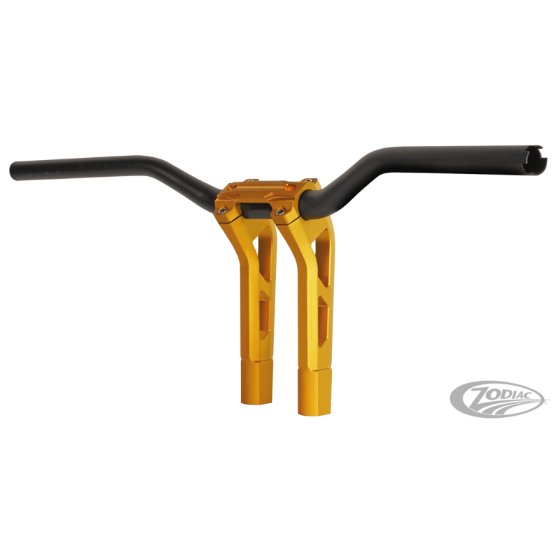 Guidon en aluminium de 1 1/4" (32mm) de diamètre, effilé à 1" du côté commande du guidon. Livré complet avec des risers en aluminium usiné avec une potence pour modèles Harley-Davidson avec fourches avant télescopiques et écartement de 3 1/2". Ces guidons sont prêts à être utilisés avec tirage électronique "Throttle-By-Wire" et également aussi pour tirage à câble ordinaire.Ils sont dotés de la finition OPS bicolore à texture exclusive de PM.
