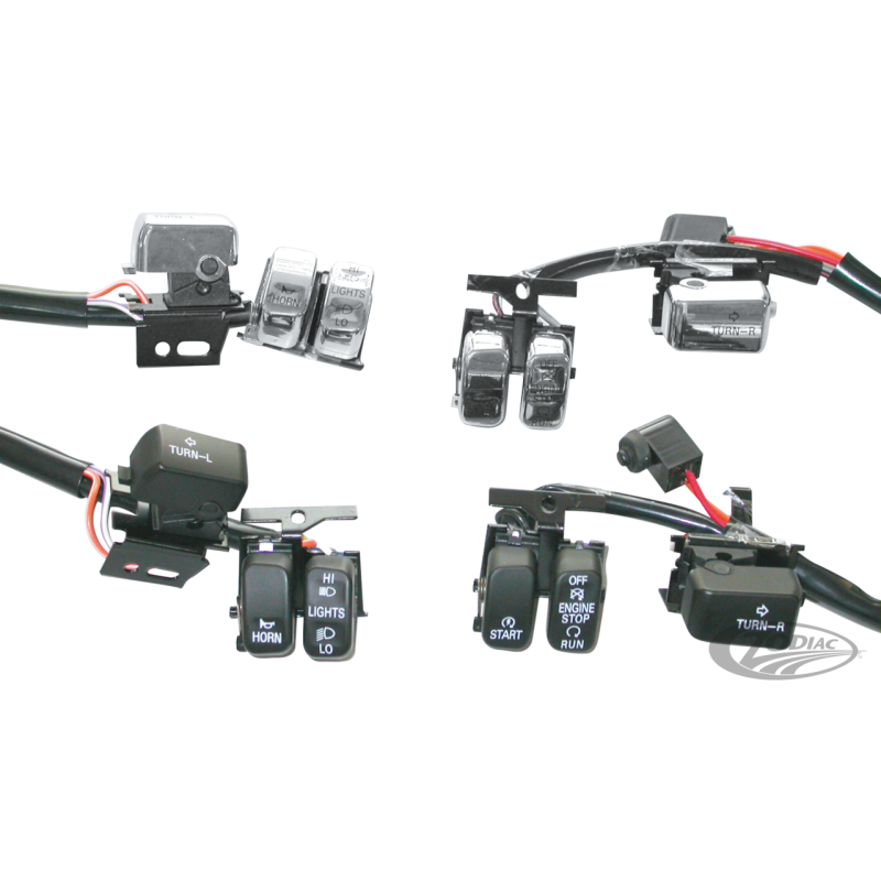Ces interrupteurs ergonomiques sont conçus pour les modèles de 1996 au présent avec les commodos ronds. Plus qu'un accessoire chromé, le contour arrondi des interrupteurs les rend plus facile à manipuler et ceci même avec des gants. Comme avec ceux d'origine des derniers modèles, ces interrupteurs ont une meilleure résistance à l'eau et à l'usure. Ils sont livrés avec des faisceaux de fils de 48" de long avec les couleurs correctes. Conformément aux nouvelles réglementations Européennes les boutons doivent comporter des symboles sur les machines neuves mais ils existent aussi en version à lettres. Disponibles en version chromée avec lettres noires ou noirs avec lettres blanches, en kits complets ou en interrupteurs individuels. Ces kits comprennent, fils et prises, vis de montage et instructions. Les versions 20007 au présent ont un contacteur supplémentaire sur l'embrayage.