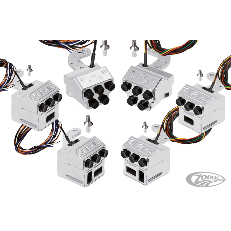 Les commodos "Ellipse" et "Comet" Rebuffini ne sont pas compatibles avec les cocottes stock, vous aurez à les installer avec ces contacteurs 2 boutons, ou 3, 4 et 5 boutons en uni ou avec gravage CE-conforme des symboles. Egalement disponible dans une version spéciale pour une utilisation avec le système audio que l'on trouve sur les modèles Touring. Tous ces commutateurs sont conçus pour une utilisation sur les modèles 1996 et après mais nécessitent l'achat séparé de "The Switchbox" module CAN-bus ZPN746880 pour CAN-Bus (HD-Link) des 2011 au présent Softail 2012 au présent Dyna et 2014 au présent Sportster et Touring.