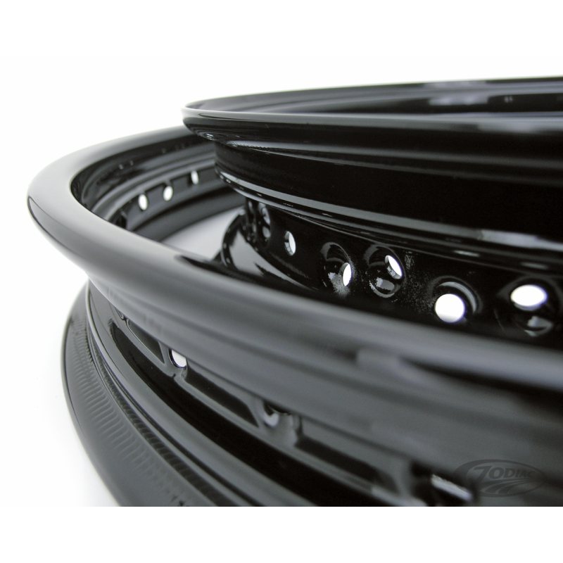 Pour le constructeur de customs qui veut ce look spécial "Cafe Racer", Zodiac propose des jantes époxy noires brillant style stock ou à bord roulé. Note: Harley a changé le profil de jante et le rayonnage en 2005 sans changer les refs des jantes. Les jantes à partir de 2005 nécessitent des rayons plus longs, raison pour laquelle elles se réfèrent à de nouvelles références pour les rayons.
