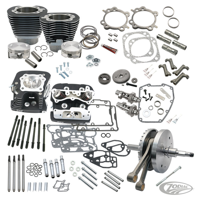 Ces kits 124CI hot set up permettent de convertir un moteur stock Twin en un 124CI (2031cc !) en utlisant les carters d'origine. Ceci donne plusieurs avantages comme celui de conserver vos numéros de cartes moteur d'origine et de couter beaucoup moins cher. Beaucoup des composants moteur d'origine sont réutilisés comme les carters, pompe à huile, couvercle de cames, poussoirs. Comprend des culasses S&S 91cc de volume qui donnent 10.8:1 de compression. Facile à démarrer grace aux cames S&S Easy Start. Les kits comprennent cylindres/pistons 4 1/8" d'alésage, vilebrequin 4 5/8" de course pour moteurs Twin Cam A et B, un jeu de cames S&S 640 et toute la visserie requise ainsi que les joints et instructions. Pour complèter ces kits un kit carburateur Super G doit être commandé pour les versions à carburateur. Les modèles injection requièrent l'achat du système S&S Variable Fuel Injection (VFI) Dynojet PowerVision, ThunderMax ou TwinTec TCFI. En option vous pouvez aussi commander le kit S&S tuned induction pour injections.