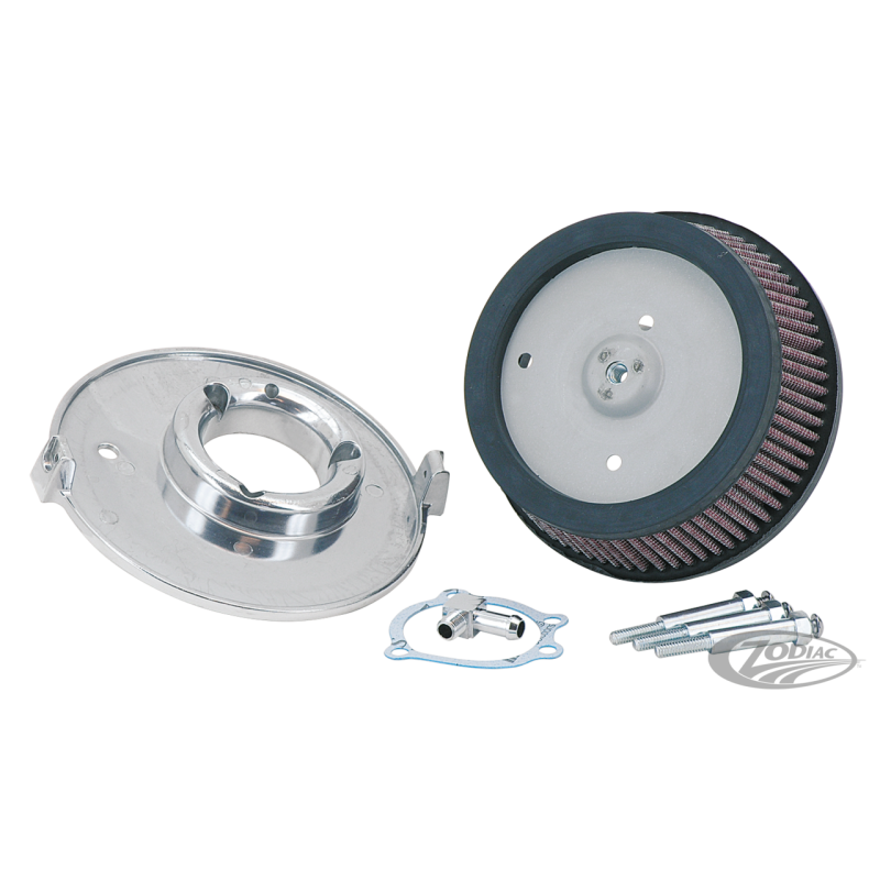 Ce support en aluminium comporte un cornet intégré qui donnera un meilleur écoulement d'air pour plus de puissance et de couple sur toute la plage de régime moteur. Ce kit est livré complet avec élément filtrant haut débit, joint et toute la visserie requise. Pour tous les carbus CV d'origine des Evolution Big Twin, Evolution Sportster, et Twin Cam ainsi que les modèles avec injection Delphi des Twin Cam à partir de 2001 et tirage à câbles. Doit être utilisé avec le couvercle d'origine rond ou ovale et une patte de support.