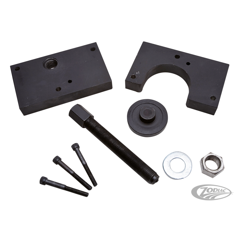 Un autre outil innovateur de Jims qui installera précisément le roulement à billes dans la trappe de transmission. Permet aussi de les arracher sans erreur et peut aussi être utilisé sur un établi sans aucun besoin d'une presse. Livré complet avec feuille d'instruction pour les transmissions à 6 vitesses comme utilisé de 2006 au présent Dyna, 2007 au présent Softail et 2007 au présent des modèles Touring.