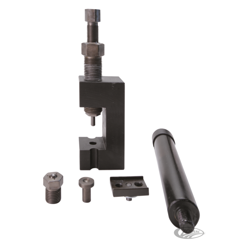 Cet outil permet de dériveter les chaines à rouleaux pour des largeurs jusqu'à 630 et ira sur toutes les chaines standard O-ring de dimensions 520, 530 et 630. Il permet aussi de riveter les chaines jusqu'à 530. Le kit pour riveter et presser la chaine jusqu'à 530. Les vis d'attachement de l'outil sont traitées pour la solidité. L'extracteur est précisément guidé avec un guide amovible pour assurer sa durée de vie. L'outil peut être vissé sur un établi ou tenu dans un étau ou encore tenu à la main. Quand il est monté sur une surface solide vous pouvez utiliser un clef à chocs ou électrique pour casser la chaine. Cet outil surdimesionné est recommandé pour toutes les chaines renforcées et une utilisation intensive.
